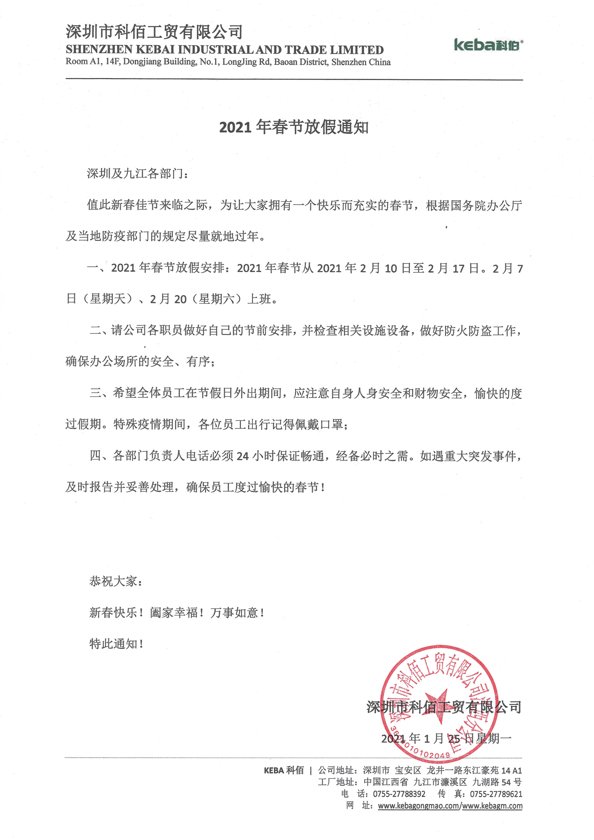 深圳市科佰工貿(mào)有限公司2021年春節(jié)放假通知