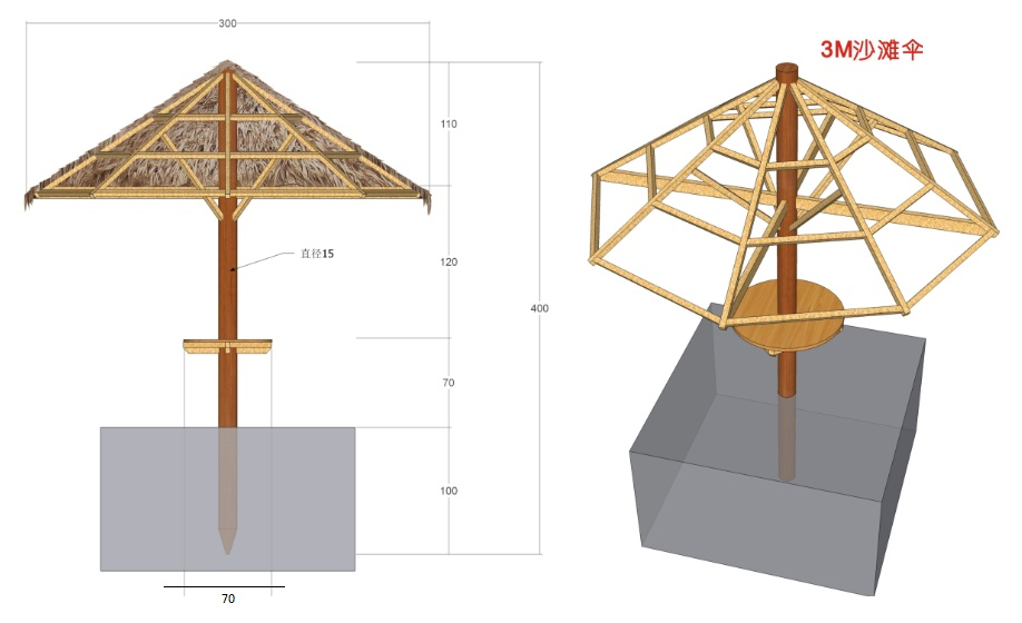 檐口直徑:300cm;立柱直徑:15cm;傘面材料:科佰所有型號草型均可應(yīng)用;傘架結(jié)構(gòu):防腐木質(zhì) 或 鋼結(jié)構(gòu);可根據(jù)客戶需求設(shè)計定做特殊尺寸規(guī)格造型。
