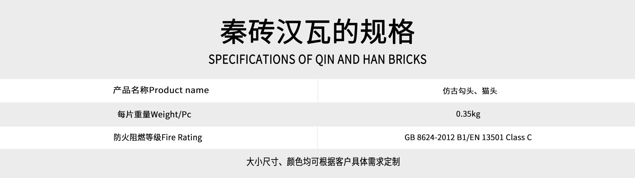 仿古勾頭在自然環(huán)境中具有更佳尋常的耐久性,它即使長期暴露于紫外線、強光、潮濕、寒熱等惡劣環(huán)境下,仍能保持其顏色和物理性能的穩(wěn)定性。經(jīng)試驗檢測證明,可以確保15年△E值小于5。秦磚漢瓦通過了12000小時的人工老化測試,檢測結(jié)果△E=3.86。(根據(jù)太陽照射量和年日照時間,12000小時檢測試驗相當于自然使用45年,遇冷不脆、遇熱不軟,長期使用環(huán)境溫度-40℃至200℃,與鋼鐵熱膨脹系數(shù)基本一致,使因溫差產(chǎn)生的位移基本相等。