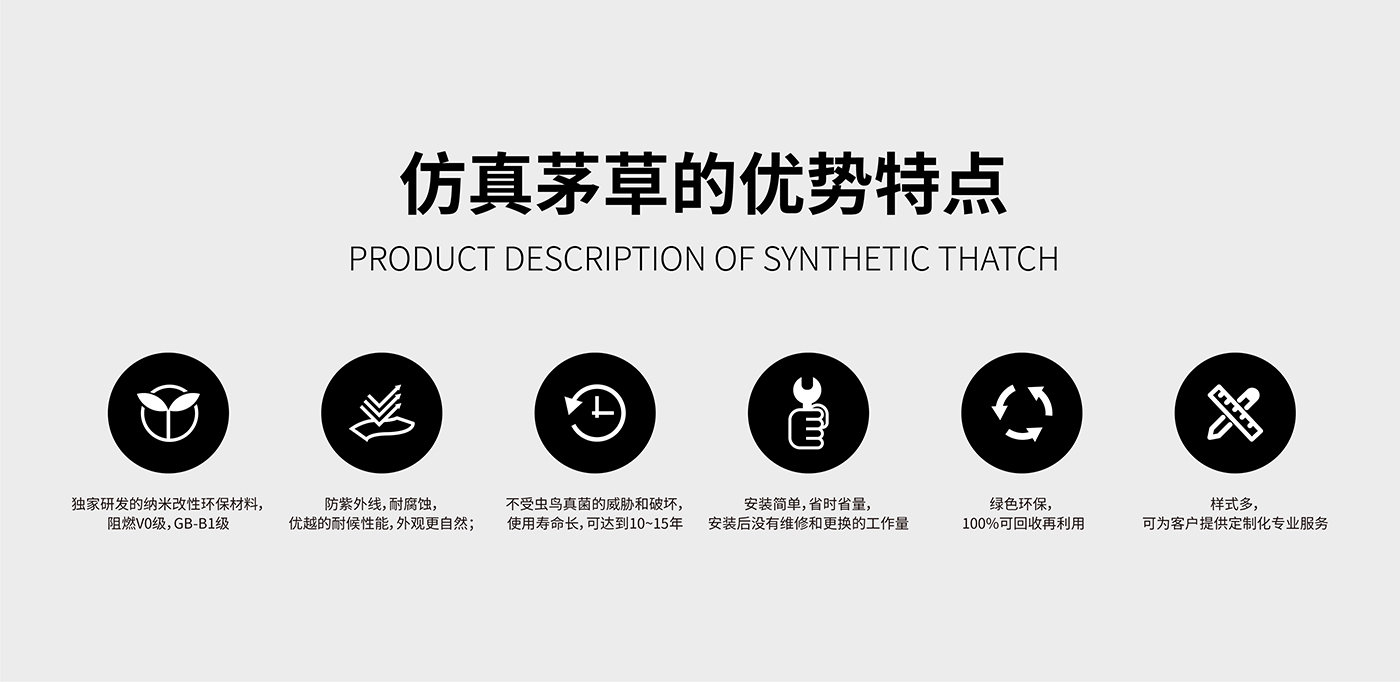 ? ? ? ? 防水仿真茅草是深圳市科佰工貿有限公司采用目前國際上先進的納米合成高分子材料技術和工藝生產。利用納米粒子的特有的物理化學性質,使得其具有更加優異的耐候性及阻燃性,能滿足美國ASTM-G154-06 抗UV老化測試標準,并能通過美標UL94-V0級阻燃,在國內仿真茅草也通過了國家防火建材阻燃測試B1級。?