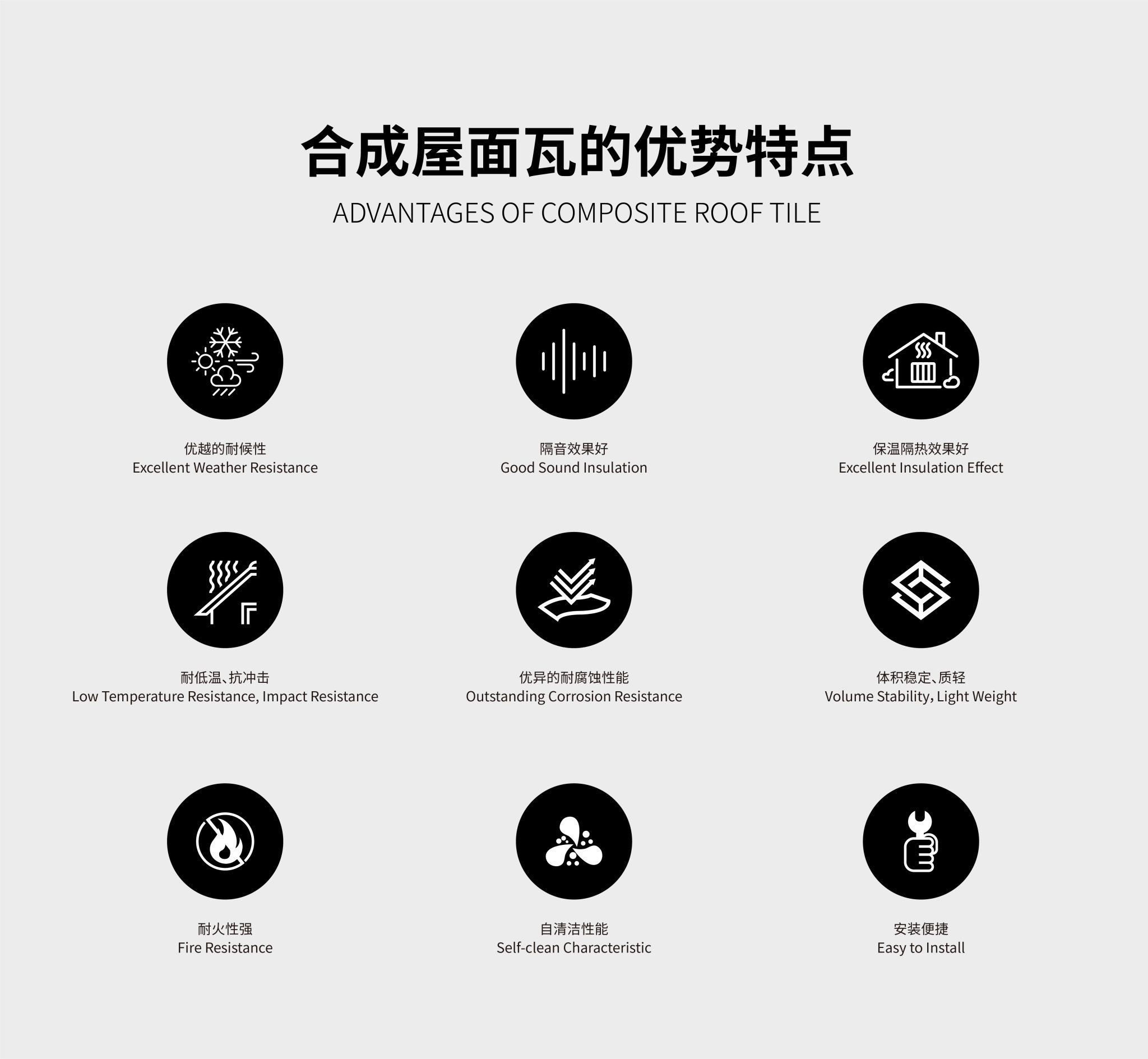 在低溫(-40℃)凍融循環下,經落球沖擊實驗,一公斤重鋼球1米高自由落下,無碎裂現象;在常溫下(23±2℃)經落球沖擊實驗,一公斤重鋼球3米高自由落下,在屋面瓦的表面上不會產生裂紋或貫穿孔。